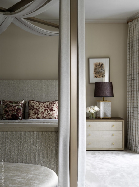 Все спальни находятся на втором этаже, и у каждой свой особенный характер. Хозяйская — выдержана в спокойных тонах. Главная роль там отведена кровати по дизайну Натальи. Она переосмыслила традиционную модель с балдахином на современный лад. Цветовую гамму этой комнате задала ширма, расписанная вручную художником Freddie Wimsett. Основной бежевый и темные бордовые оттенки были позаимствованы как раз с нее. Гостевая спальня, наоборот, радует глаз обилием красок и узоров. В обеих комнатах, помимо спального места, есть небольшие зоны с мягкой мебелью, где можно уютно устроится с книжкой или чашкой чая.