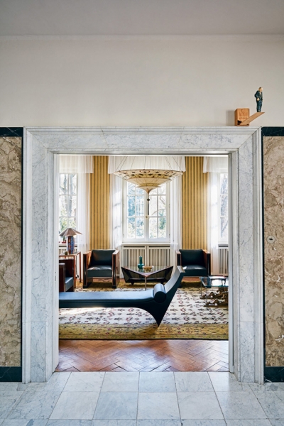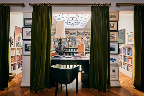 Круглые арочные стеклянные дверные проемы выходят прямо в сад и на террасу, откуда открывается прекрасный вид на реку. Впечатляющий фасад с колоннами и интерьер, вдохновленный классическим дизайном римской архитектуры, — это отражение стиля самого модельера.