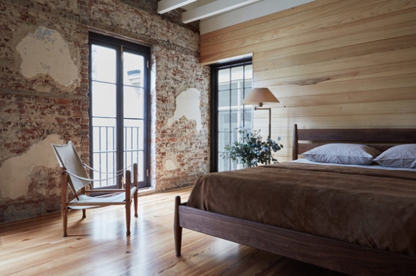 Архитекторы бюро решили подчеркнуть многолетнюю историю дома и оставить открытыми деревянные потолки, трубопровод и потускневшую кирпичную кладку. Пару каминов, служивших раньше для приготовления пищи, дизайнеры тоже решили не трогать, а образовать вокруг них открытую кухню, столовую и гостиную на первом этаже.