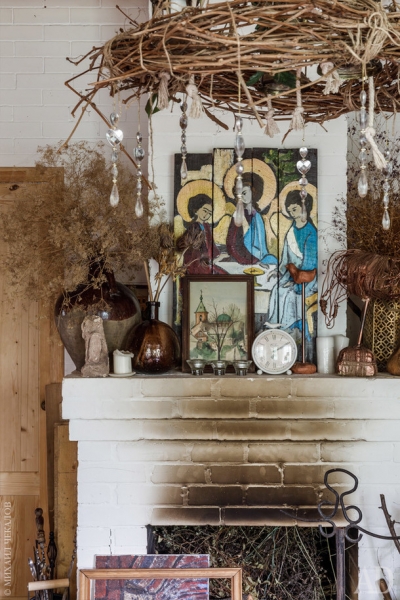 Фрагмент гостиной. На камине икона, написанная мамой, и лошадка, которую она сделала из проволоки. Люстра сделана из виноградной лозы из собственного сада.