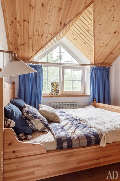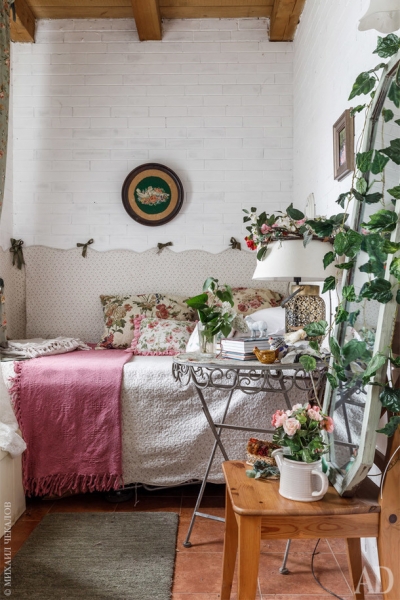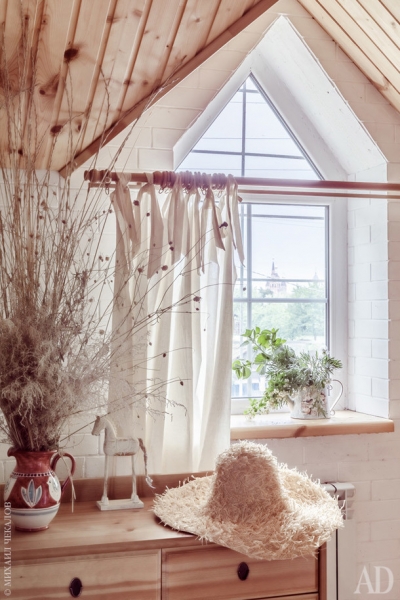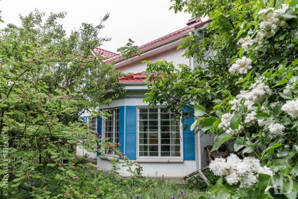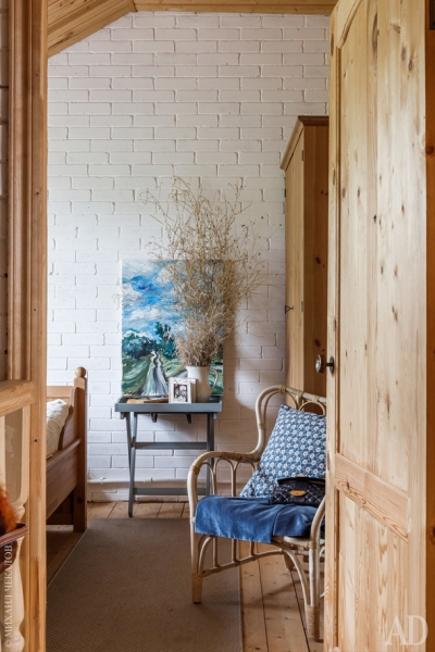 Когда-то на участке стоял небольшой деревянный дом, но он обветшал, поэтому на его месте появилось современное кирпичное строение. Мама Алисы — архитектор, и проект начертила она, но по сути дом — воплощение детской мечты дизайнера: "Я очень хотела жить в доме из белого кирпича с голубыми ставнями и красной крышей", — говорит она. Однако внутри нет ощущения того, что это новая дача, наоборот, видно, что обстановка собиралась не один десяток лет. И это действительно так: сюда переехали предметы из старого дома, то, что осталось в наследство от бабушек, дедушек и прабабушек.