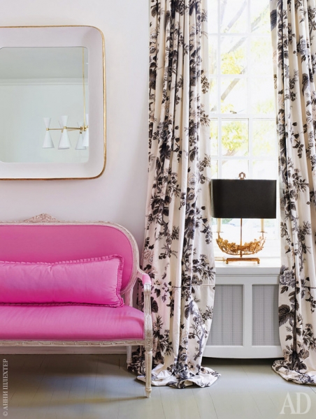 Проходная комната между столовой и гостиной. Стены покрыты глянцевой розовой краской. Диван обит тканью, Kravet.
