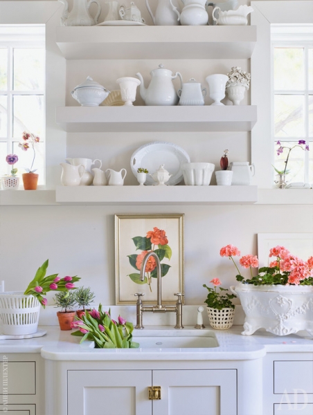 В комнате при входе в дом появились полки для коллекции фарфора и место для составления букетов. Столешница сделана из каррарского мрамора. Смеситель, Kohler.