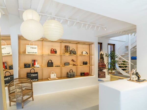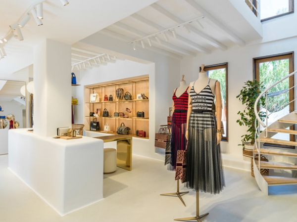 Интерьер магазина выполнен в светлых тонах: белые стены и потолки дополнены мебелью из дерева и ротанга — идеальное сочетание для курортного места. Здесь ничего не отвлекает внимания от главного — капсульной коллекции креативного директора Dior Марии Грации Кьюри. Почти все эксклюзивные вещи и аксессуары объединяет вышитая надпись Mykonos, и, соответственно, купить их можно будет исключительно на этом острове.