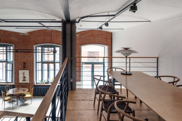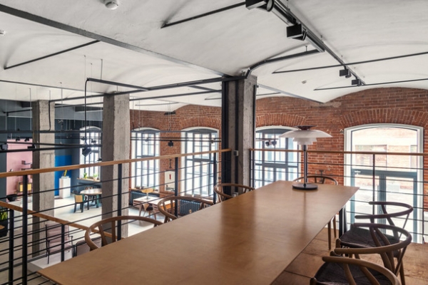 Для того чтобы подчеркнуть тот самый контекст, архитекторы оставили оригинальную кирпичную кладку, огромные окна, сводчатый потолок, бетонные колонны со следами опалубки. А деревянные подоконники, лестница, мебель и двери создали особую атмосферу, которая переносит посетителей в 60-е годы.
