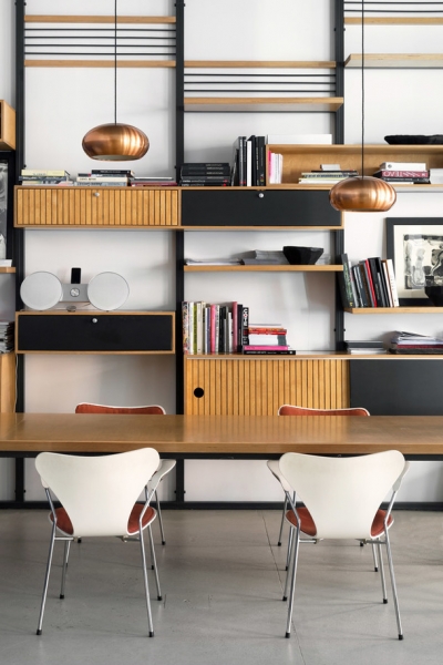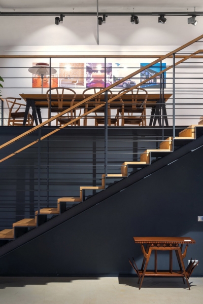 Некоторые элементы мебели были выполнены на заказ по чертежам архитекторов — это, например, стол на антресоли в переговорной части, рабочее место галериста, а также большой стеллаж около рабочего места. Выполнено и разработано все также в соответствующей стилистике.