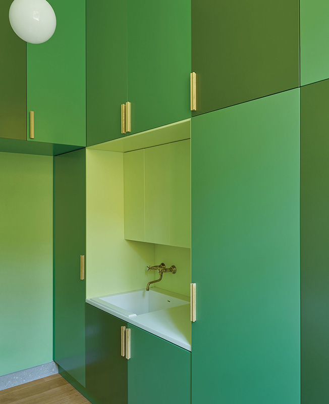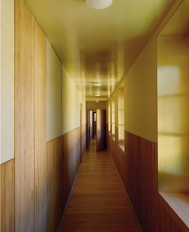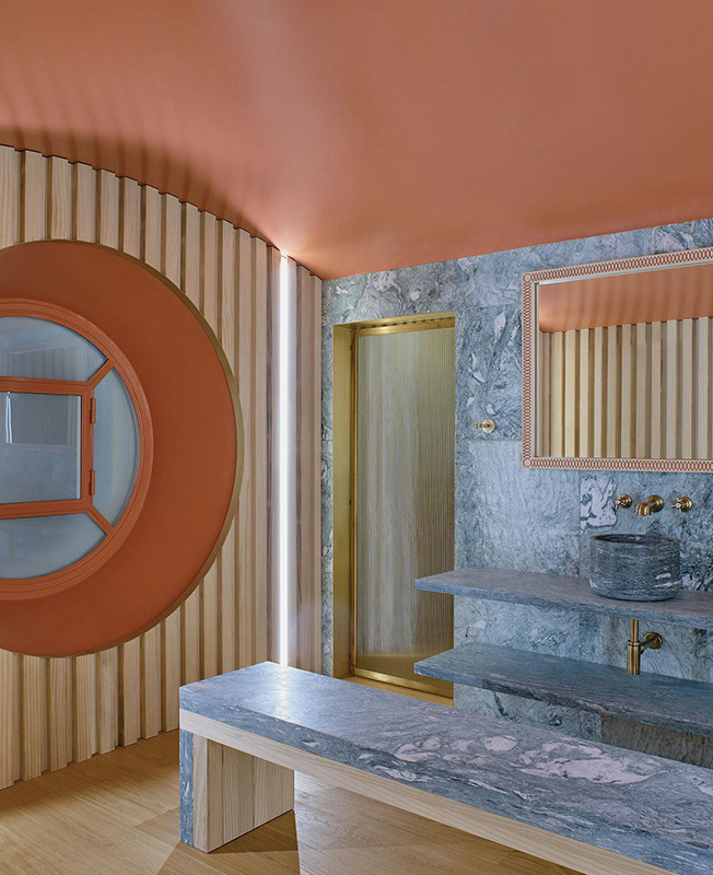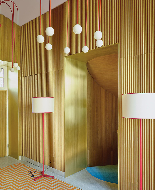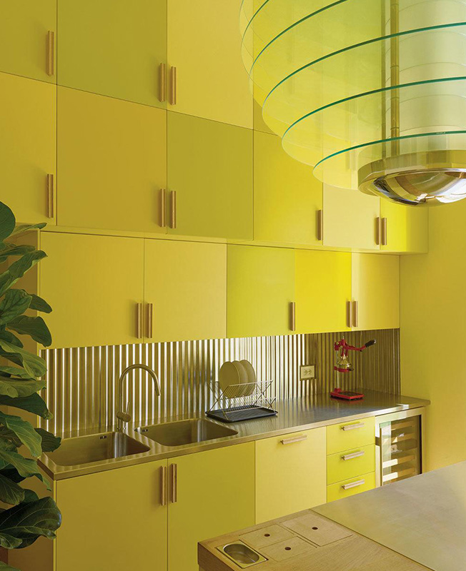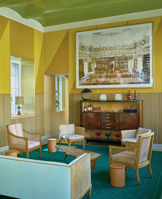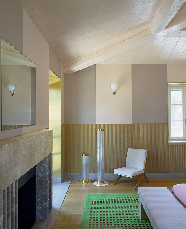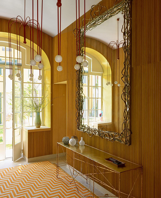 Он привлек к работе команду из 150 итальянских ремесленников и выверил каждую деталь. В доме есть латунные смесители ручной работы, раковина из голубого мрамора, стеновые панели в ткани Kvadrat, веселая кухня, составленная, как паззл, из желтых фрагментов, подземный бассейн, буазери из дубовых реек с латунью. Порой звучит морской стиль, намекая на близость вод Комо. В интерьер включена образцовая коллекция мебели 20 века, которую Маркетти собирал годами.