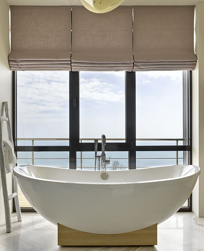 При выборе отделочных материалов мы отказались от искусственных фактур и сделали ставку на натуральные: дерево, камень, разные виды мрамора, лен, шерсть. Это было самым правильным решением, обусловленным тактильными качествами и игрой ощущений, которые дарят природные матриалы. Когда ты на Юге, тебе хочется ходить босиком по тёплому дереву, ощущать прохладу камня, прикасаться в мягким тканям и видеть естественный рисунок мраморных плит.