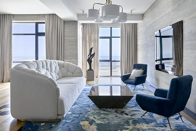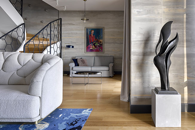 Выбор мебели происходил достаточно легко, заказчики согласовывали практически все наши предложения. Часть предметов привезена из Парижа. Настольные светильники в форме раковин куплены на рынке в Вене. Какие-то вещи были созданы нами, когда возникла такая потребность. Как раз на этапе подбора мебели мне довелось познакомиться с основателями шоу-рума Any-Home, вместе с которыми мы воплотили наши эскизы в жизнь. Обволакивающий диван и ковер, имитирующий морское дно, в главной гостиной — результат совместной работы, созданы специально под летний проект.