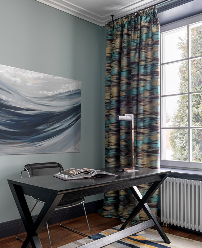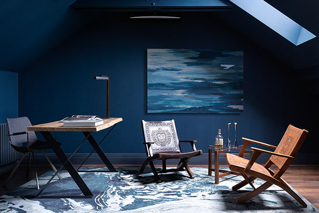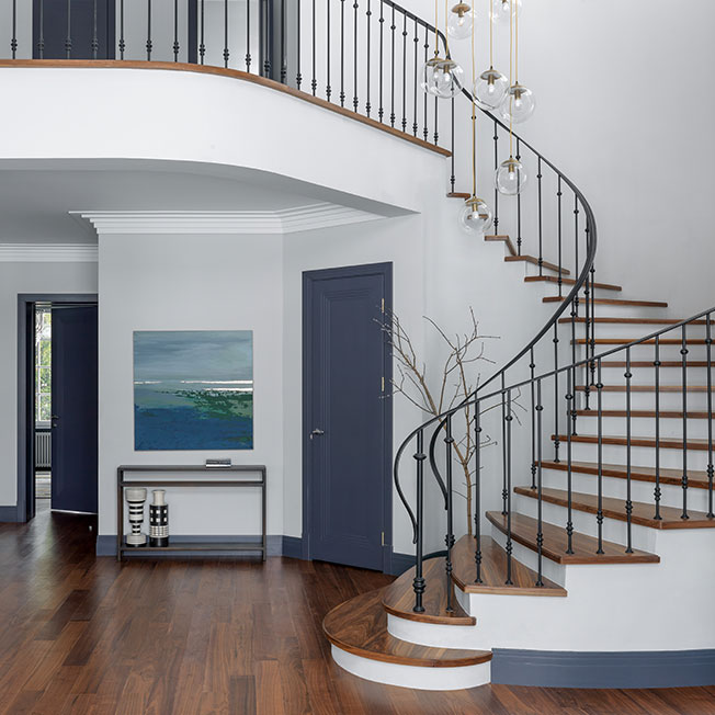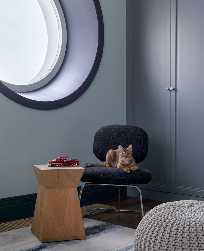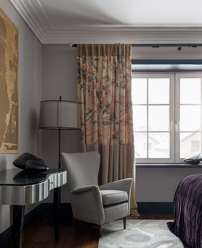 В цоколе оборудовали домашний кинотеатр, в мансарде кабинет хозяина — эти помещения выделяются среди прочих насыщенными темными оттенками. Дизайнер убеждена, что цвет отвлекает внимание от неудачных пропорций комнат, придает им атмосферу и стиль.
