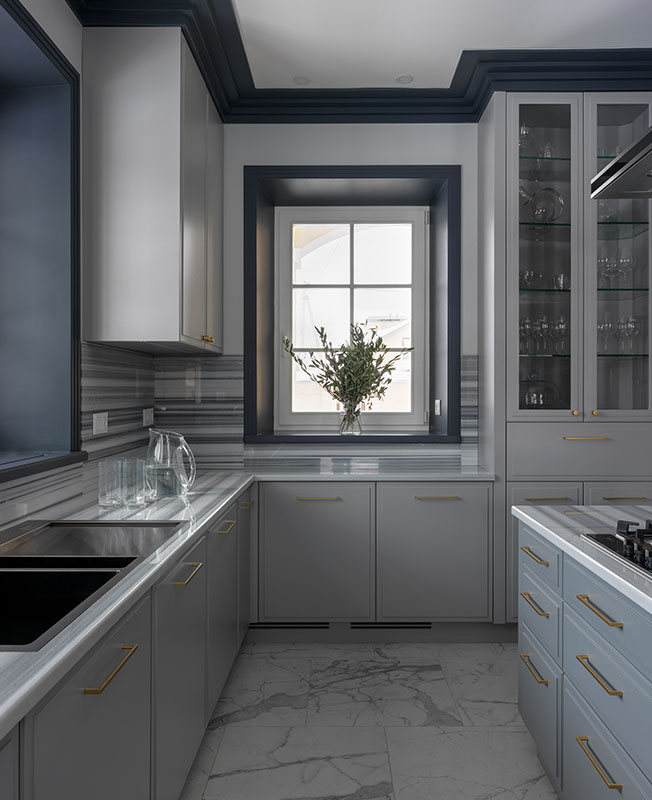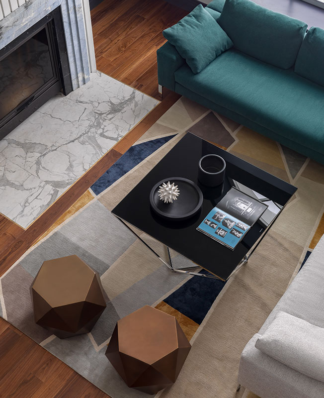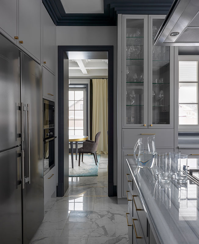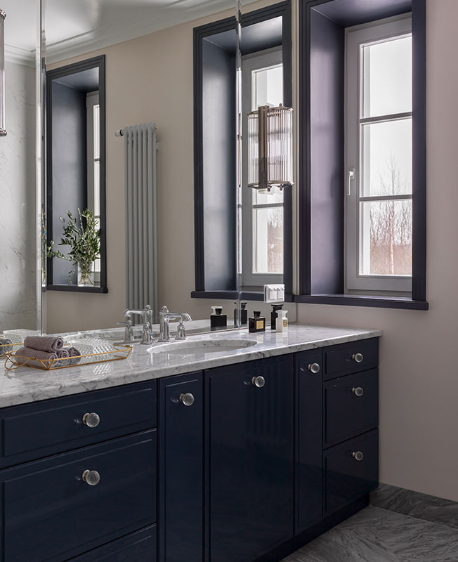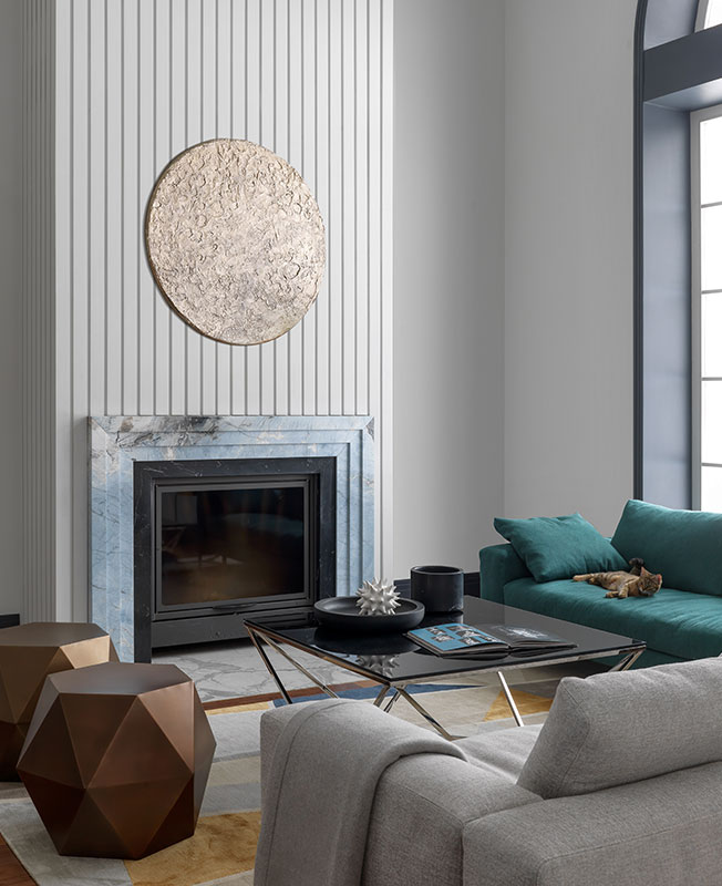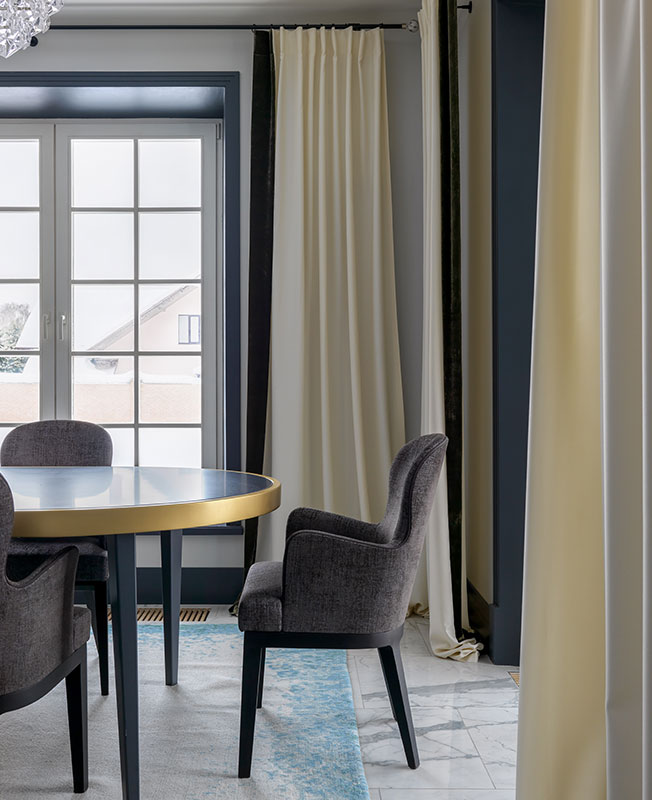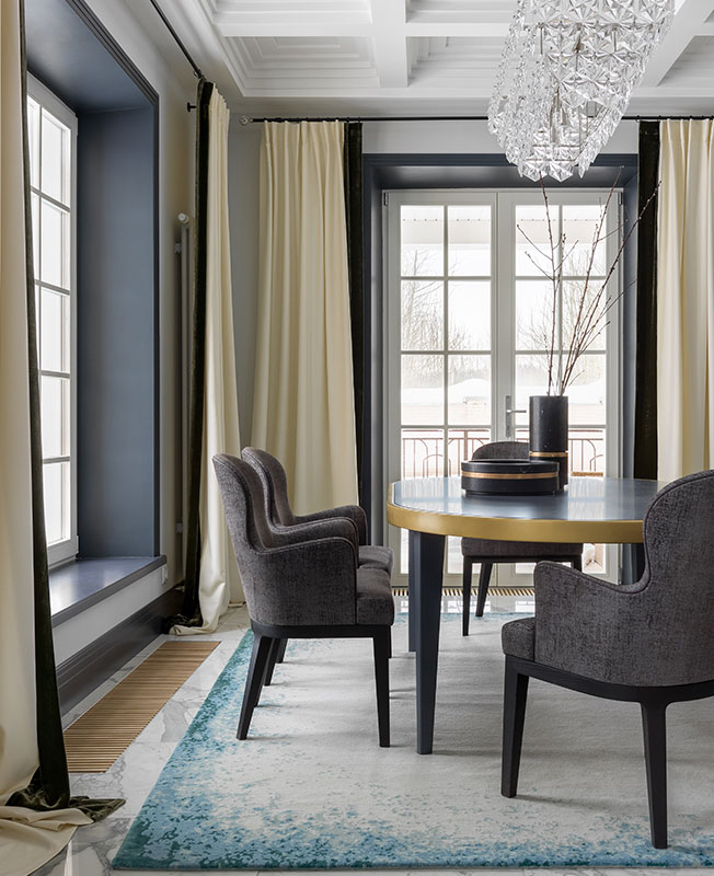 Марина Брагинская признается, что конечным результатом она довольна еще больше, чем визуализацией. Даже вынужденные изменения шли проекту на пользу. Например, не подошел изначально выбранный мрамор для каминного портала. В поисках альтернативы зашли на крошечный подмосковный склад, где почти не было выбора, и увидели необыкновенной красоты голубой слэб. Кусок отколот, цена снижена. «Вопрос стоял один: хватит нам его, чтобы отделать камин или нет. Как только поняли, что да, получится раскроить — тут же купили».