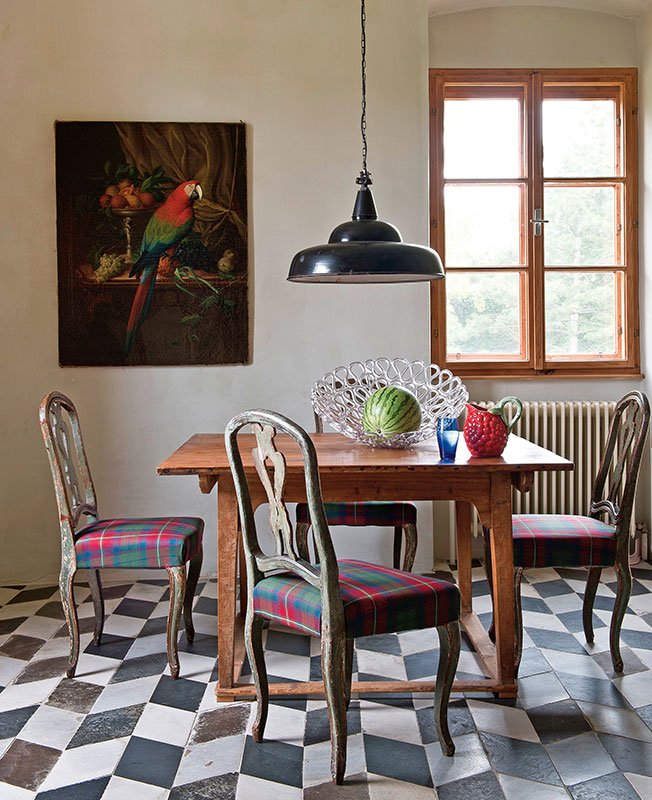 Как опытный художник и экспозиционер, Вурм умело корректирует объемы XII века. По всему дому, на двух этажах, даже в ванных, сделан дощатый пол из светлого дерева. Он объединяет пространство, визуально увеличивая комнаты, и идеально отвечает духу монастырской постройки. А кухня выложена активной черно-белой плиткой. Благодаря оптическому эффекту помещение становится более модным и теплым.