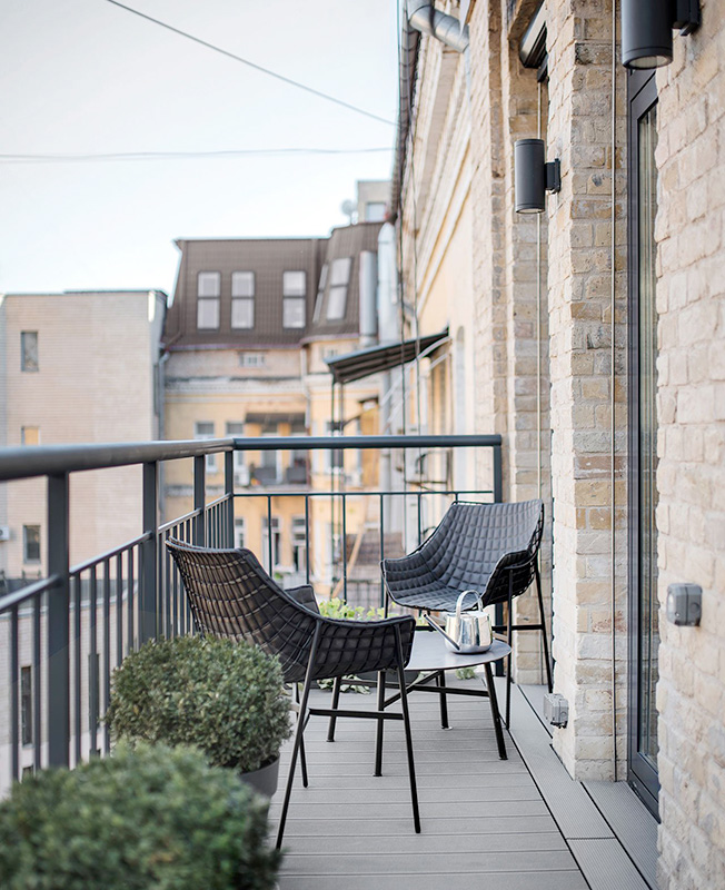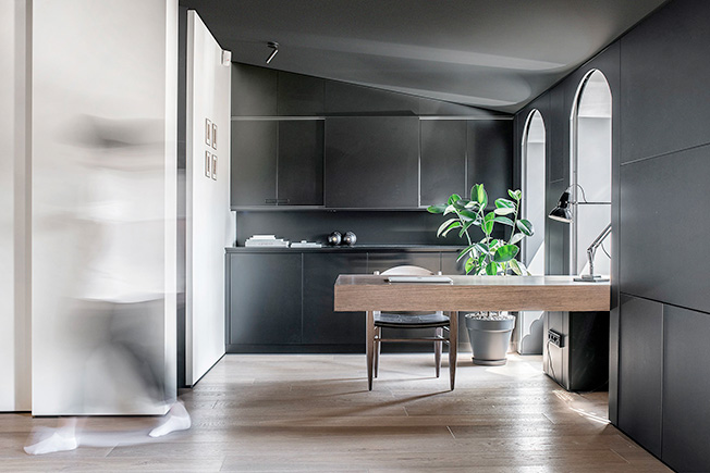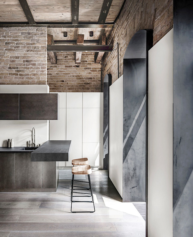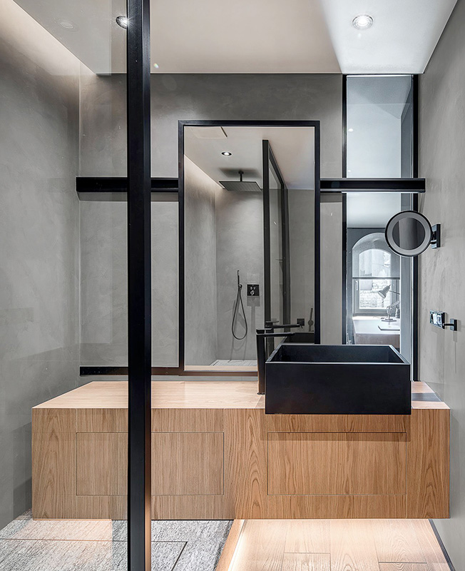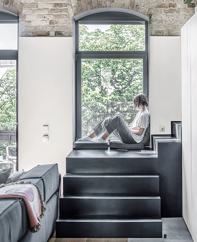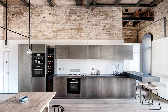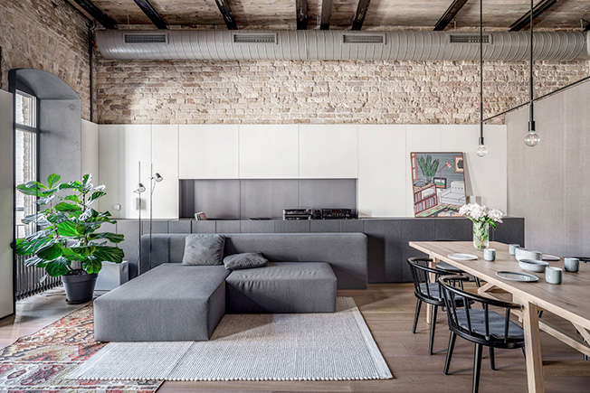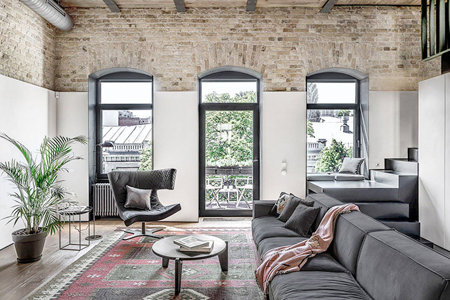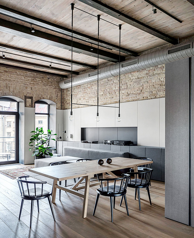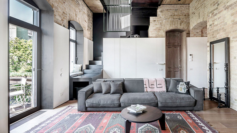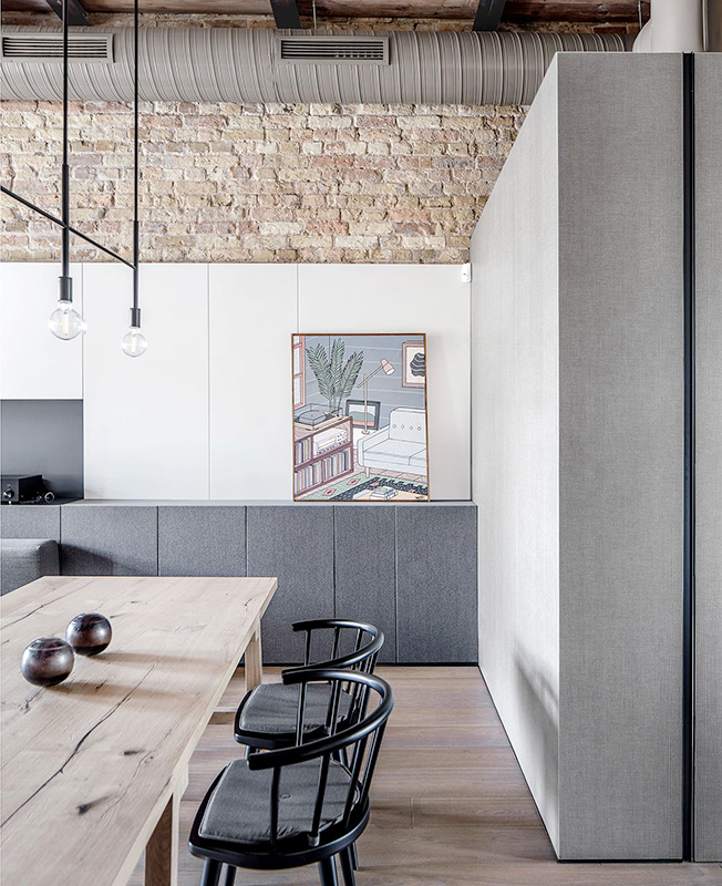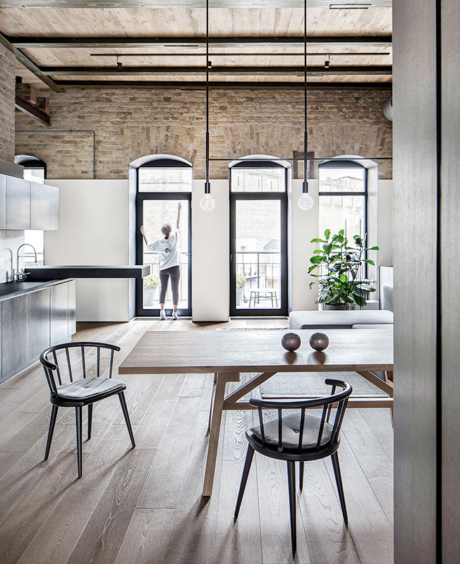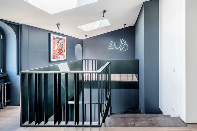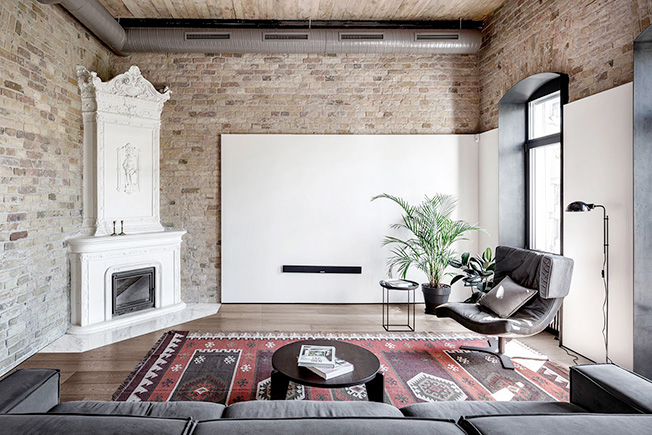 Чтобы поддержать верный баланс между старым и новым, от ярких красок отказались, сделав ставку на сдержанную нейтральную палитру, в которой преобладают белый, серый, черный цвета: они гармонично смотрятся с восстановленными историческими деталями.