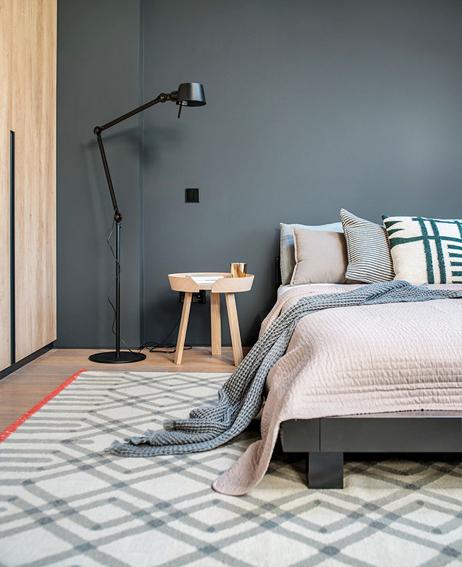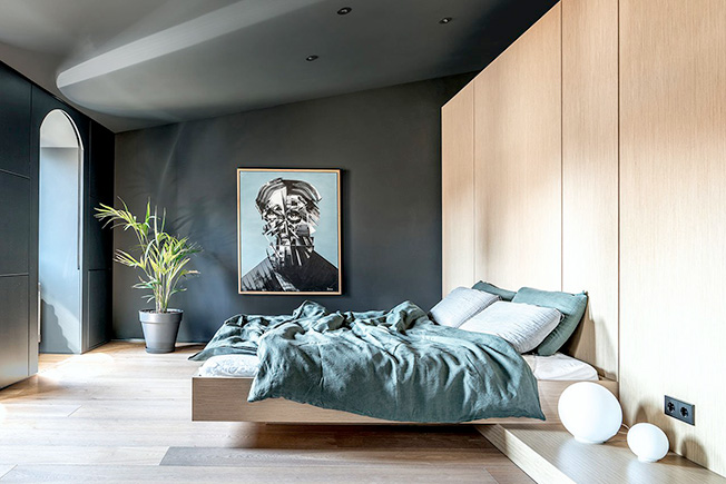 Похожее решение использовали при обустройстве верхнего этажа с частными зонами: хозяйской спальней с ванной комнатой, гардеробной, кабинетом и гостевой комнатой. Здесь панели помогли выровнять скошенные стены. На контрасте со светлой палитрой нижнего этажа выбран темно-серый цвет. Света достаточно благодаря многочисленным окнам.