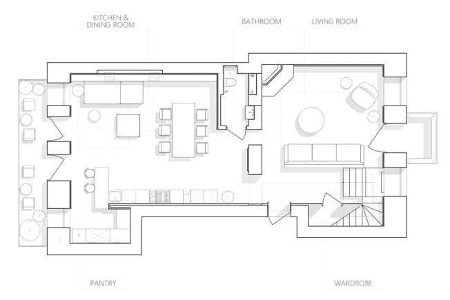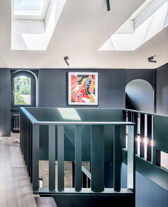Два уровня соединяет, как функционально, так и визуально, металлическая лестница, созданная на заказ и собранная вручную. Ее оттенок поддерживает темную гамму верхнего этажа, но в то же время перекликается с металлическими балками, оконными рамами и отдельными предметами мебели на нижнем этаже.