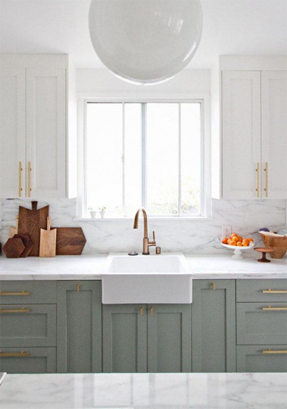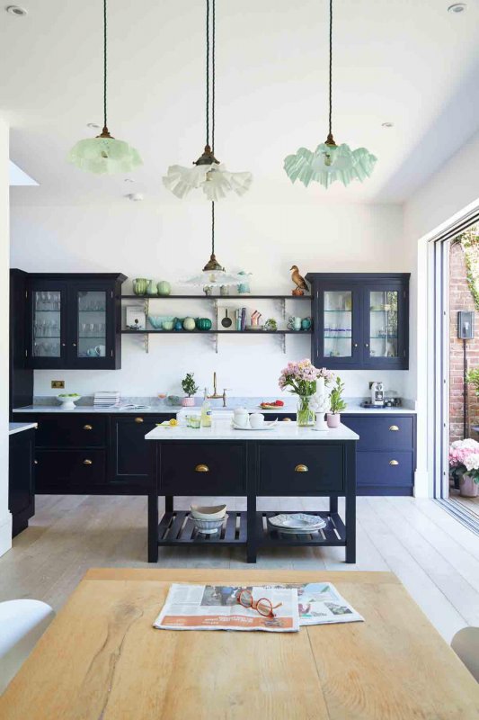 Черно-синие фасады в винтажном стиле выгодно выделяются на фоне белых стен и светлого пола. Латунные ручки выдвижных ящиков создают теплый контраст с темной доминантой – это еще одна модная интерьерная тенденция 2019-го года.