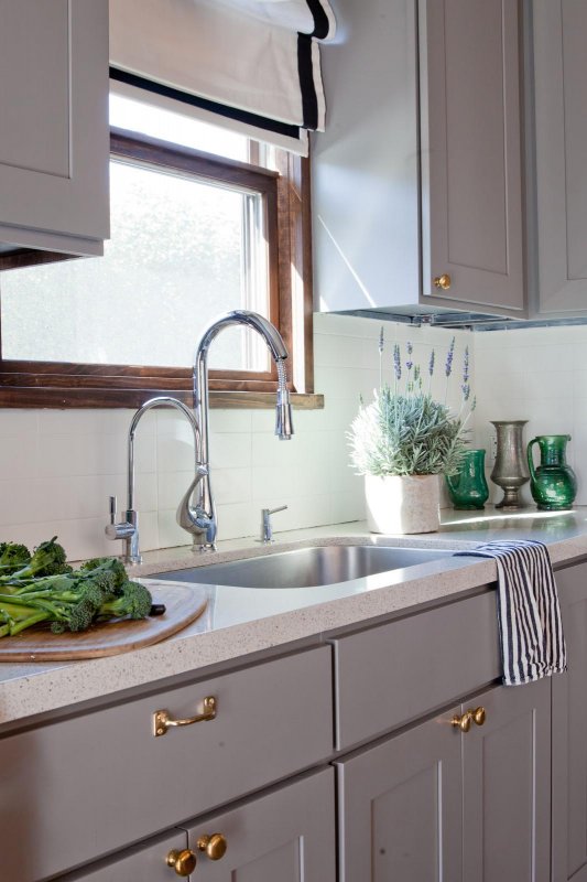 Еще один пример удачного сочетания оттенка берлинской лазури (темно-сине-серого) с белоснежным керамическим фартуком, чашей раковины и гладкими стенами.