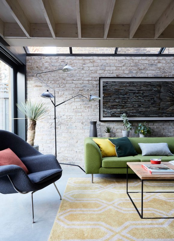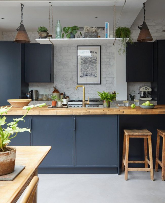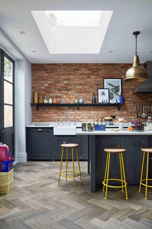 Грубую стилистику необработанной кирпичной кладки и латунной фурнитуры поддерживают темные серо-синие шкафы и полки. Уравновешивают композицию белые столешницы и желтые ножки табуретов.