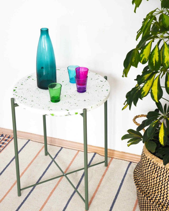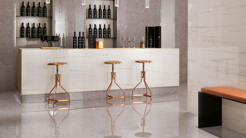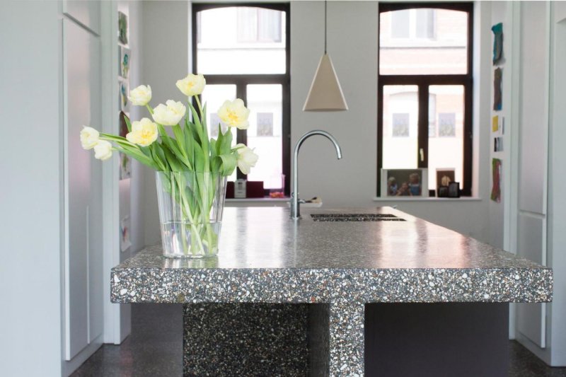 Если раньше терраццо использовали в основном для облицовки полов и лестниц, то сегодня бетонно-мозаичной плиткой украшают трехмерные полы, стены, мелкие детали декора, светильники. Столешницы из терраццо не только красивы, но и долговечны.