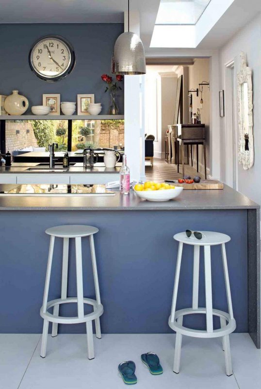 Кобальтовый оттенок в этой кухне-гостиной добавил мягкость, какой нет у серых и черных цветов. Современный блеск внесли зеркальные светильники и хромированные барные стулья. Остров комбинируется с барной стойкой, чья столешница тоже выделена синим.