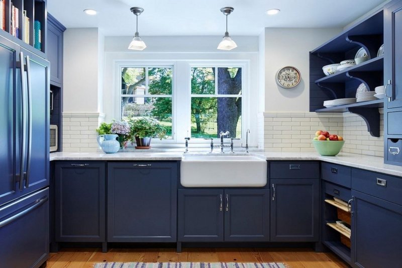 Синий рекомендовано использовать в отделке стен, фасадов, островного блока. Цвет красиво сочетается с белой и серой палитрой, так что вариантов исполнения много.