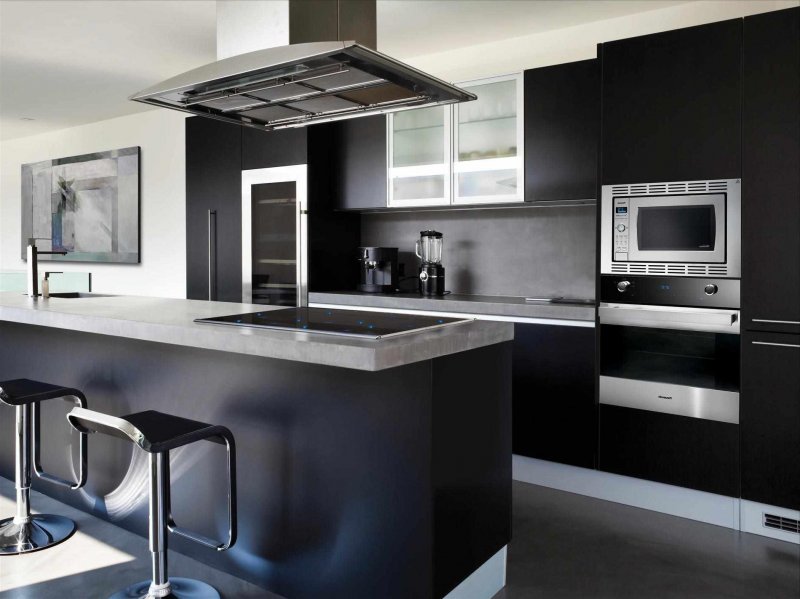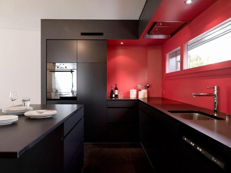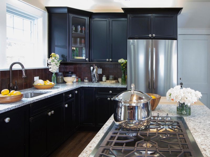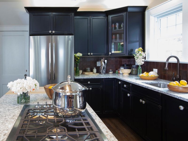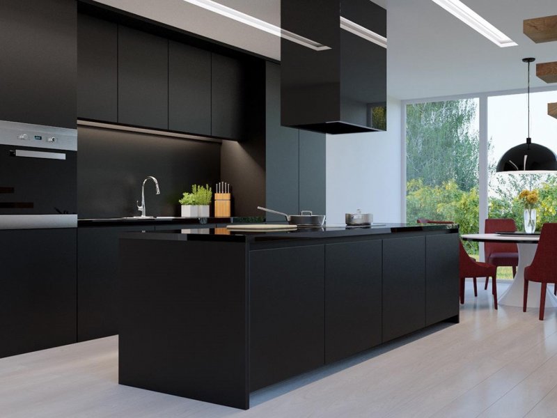 Предлагаются варианты и полностью черной кухни – с окрашенным деревом, камнем, металлом, даже раковиной. Живые комнатные растения разбавят сумрачный эффект.