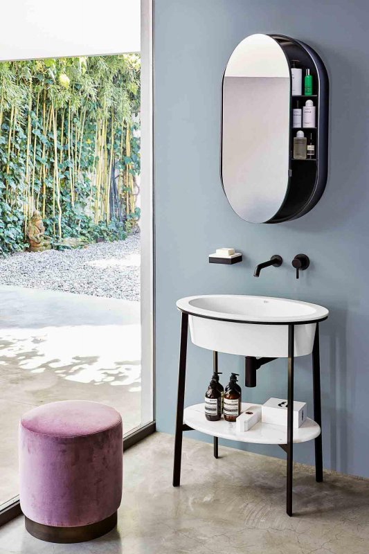Итальянские дизайнеры объединили в новой коллекции сантехники керамику, мрамор и сталь, добавили сюда зеркало-шкафчик. Раковины могут быть изготовленны в 16 матовых оттенках и иметь овальную, круглую или прямоугольную форму.