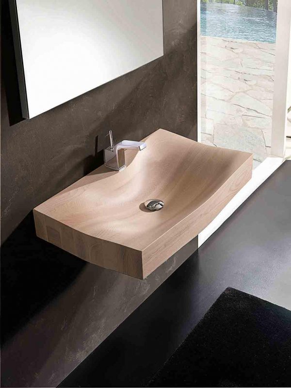 Как вам раковина из цельного куска древесины с углубление в виде волны? Поверхность отполирована и покрыта восемью слоями водозащитного покрытия.