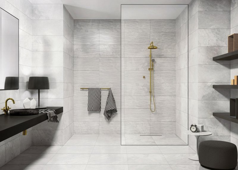 Вариант комбинирования монохромной керамической плитки под мрамор – прямоугольной и с 3D-эффектом. Мягкие нейтральные цвета с глянцевой отделкой создают выгодный фон для золотистой фурнитуры и темного дерева.