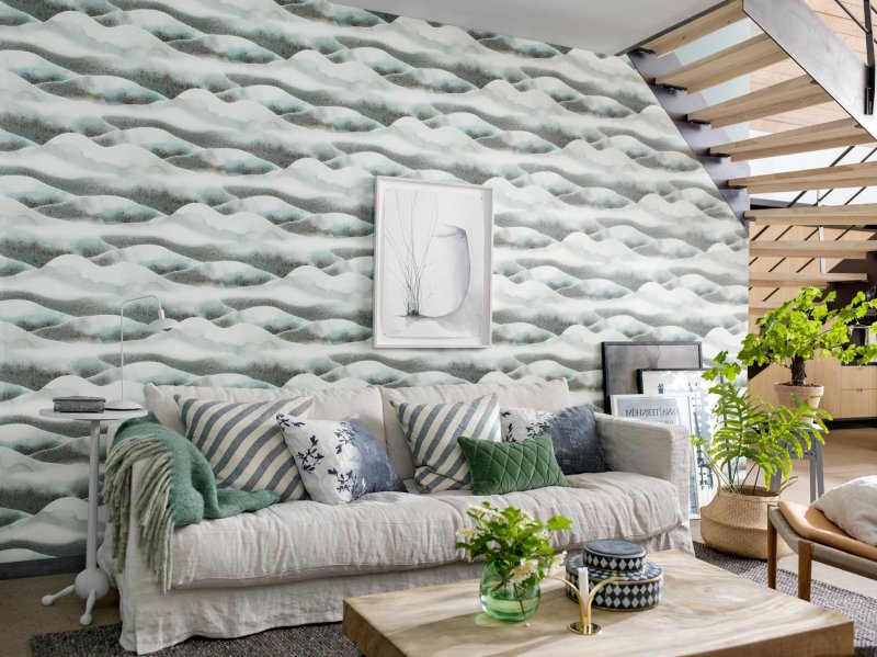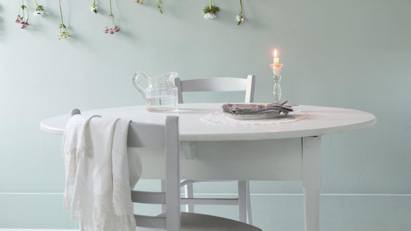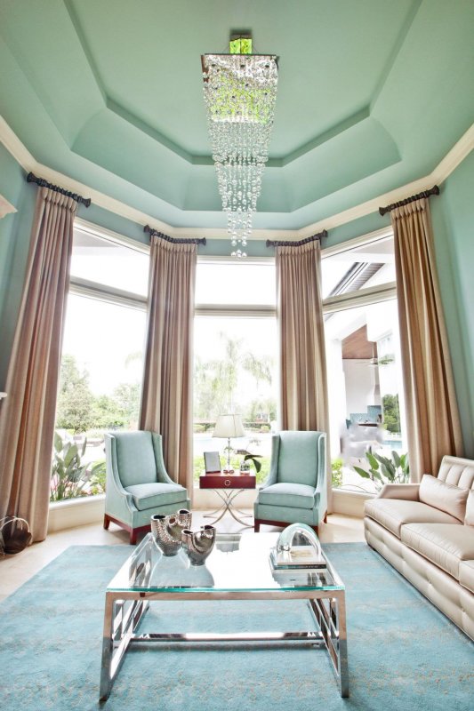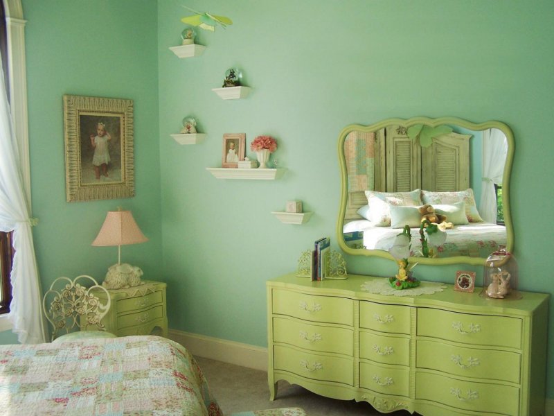 Светлый мятный оттенок оказывает расслабляющее действие на психику, не случайно его используют как дополнительный цвет для красного. Приятно смотрится в гостиных, спальнях и ванных комнатах.