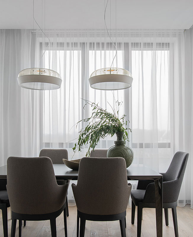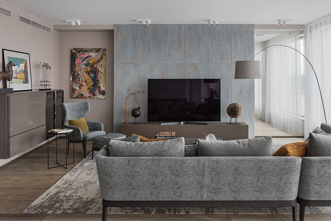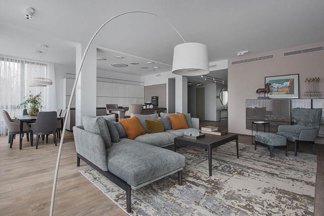 Конструктив квартиры площадью 165 квадратных метров способствовал созданию рационального планировочного решения. Одно из несомненных достоинств — потрясающий вид из окна — был использован архитекторами на все сто процентов.