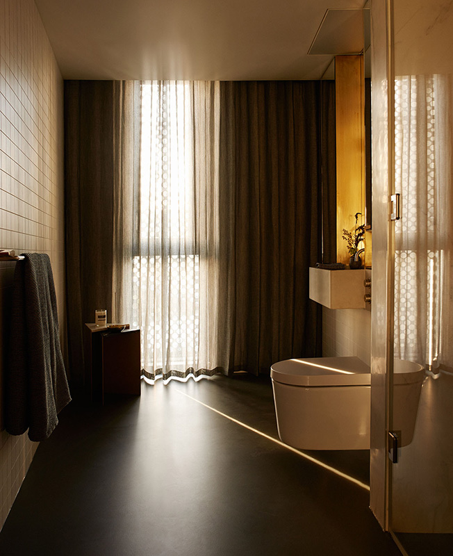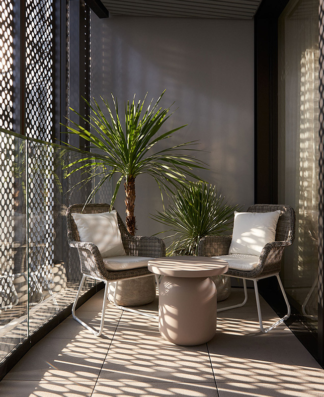 Из-за расположения в цилиндрах квартиры имеют клиновидную форму. Сложную планировку архитекторы обыграли, превратив в достоинство жилья: ближе к внешним стенам с панорамными окнами и балконами расположили гостиные и спальни, обеспечив комнаты дневным светом. Ажурные перфорированные ставни превращают свет в элемент декора. Эта деталь визуально объединяет все квартиры комплекса и обеспечивает приватную атмосферу. При желании ставни открываются.