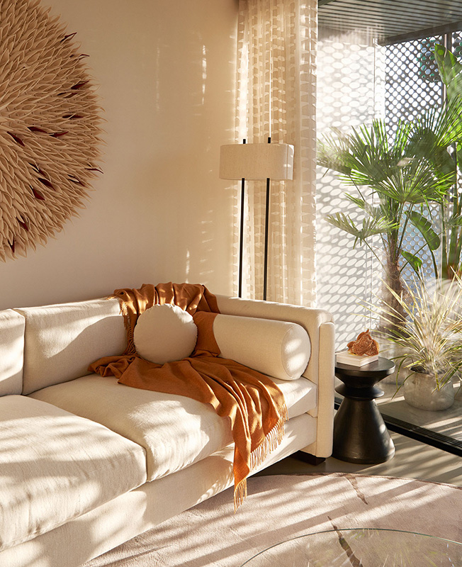 Апартаменты с двумя спальнями площадью 88 кв. метров по утрам заливает солнечный свет и окрашивает пространство в золотистые тона. С природой решили не спорить — выбрали для интерьера преимущественно светлые, нейтральные оттенки, создав многослойный эффект за счет разницы фактур. Исключение сделали лишь для кухни, оформленной в сине-золотых тонах.