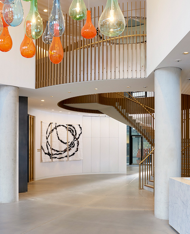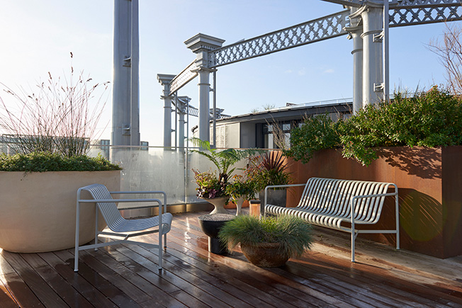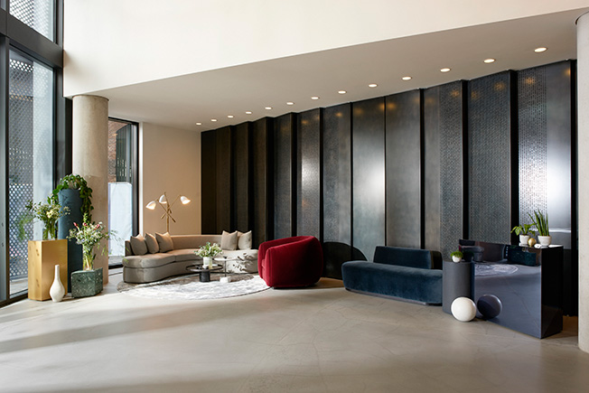 Дизайнеры студии No. 12 принимали участие и в оформлении общественных пространств жилого комплекса: лобби, бизнес-лаунджа, зоны отдыха и сада на крыше. Здесь также использовали предметы, созданные на заказ, и много вещей по дизайну британских авторов. Нейтральную палитру разбавили сложными оттенками зеленого, красного и синего, использовали элементы из древесины и натурального мрамора. На крыше, огороженной полупрозрачными панелями, открытая терраса с современной мебелью и аксессуарами из антикварных магазинов.