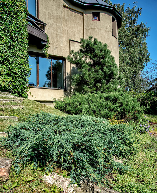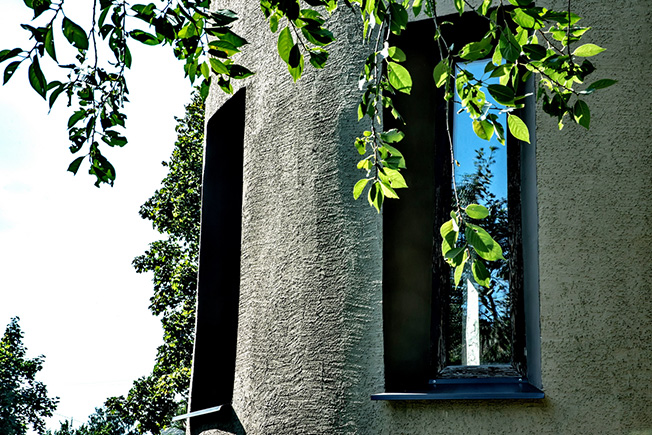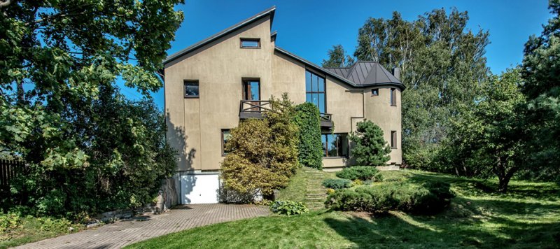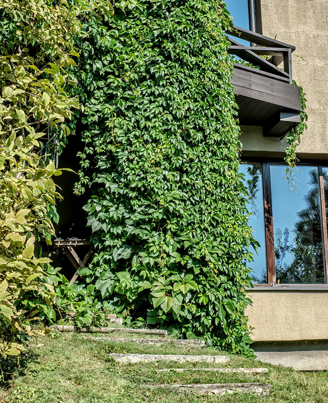 Трехэтажная постройка в духе петербуржского модерна стоит на небольшом холме, среди зелени сада, с увитыми виноградом стенами, в окружении яблонь и рододендронов, луговых трав, мха и туи.
