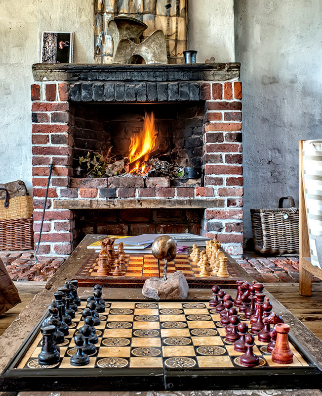 Внутренние пространства плавно перетекают одно в другое. На первом этаже располагается гостиная с большим камином из неоштукатуренного кирпича. Здесь же кухня с выходом в сад, санузел, техническая комната. Деревянная лестница ведет в приватную зону на второй этаж: его заняли художественная мастерская, спальня, кабинет и терраса. На третьем, находится еще одна спальня и рабочий стол младшего сына хозяина дома.