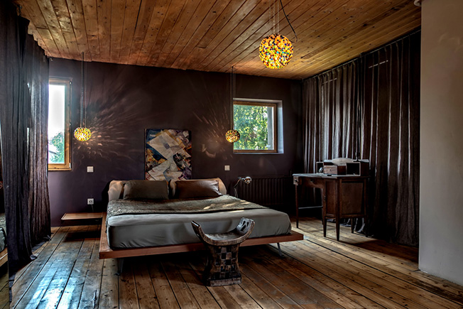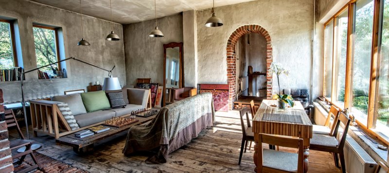 Аскетичный облик фасада повторяется в интерьере, для отделки которого использовали натуральные фактурные материалы: бетон, глину, древесину. Они красиво стареют, привлекают спокойной палитрой и отвечают японской эстетике «скромной простоты» ваби-саби. А также служат гармоничным фоном для винтажных предметов 1940–70-х годов, старинных зеркал, коллекции книг и русского искусства — работ Марии Алексеевны Гороховой, Валерия Шабловского, Александра Павловича Зайцева и других.