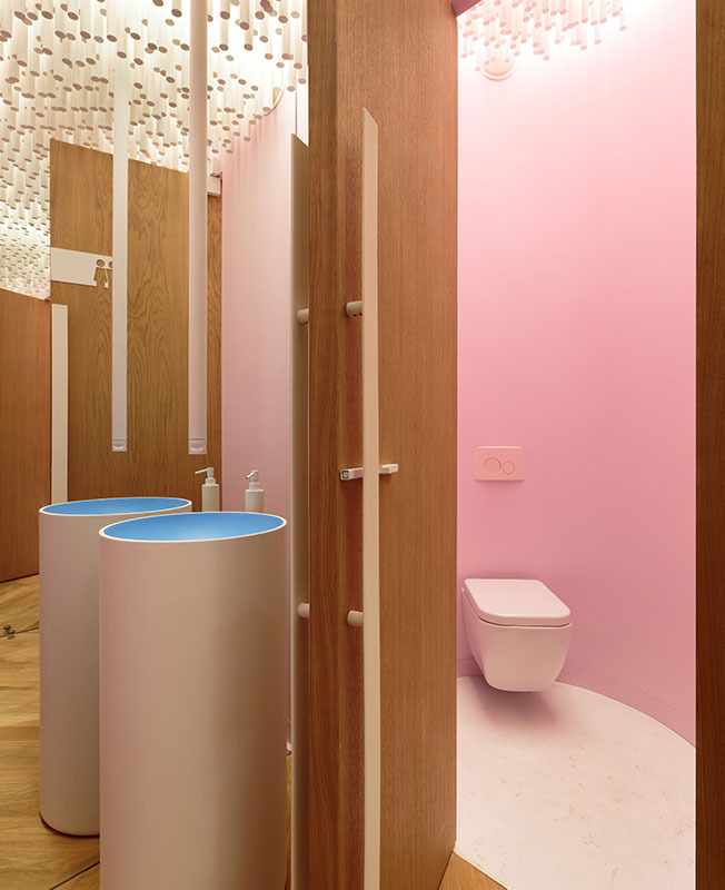 В санузлах потолок с подсветкой набран из множества белоснежных трубок разной длины. Стены окрашены в нежно-розовый и облицованы зеркалами в полный рост, расширяющими пространство компактного помещения, проемы оформлены дубовыми дверями в потолок.