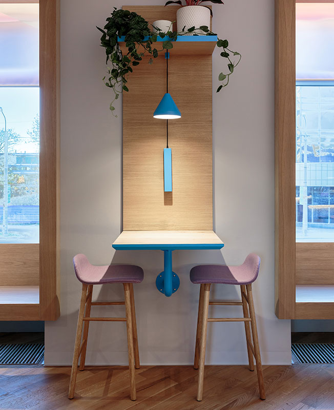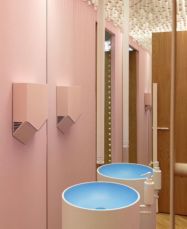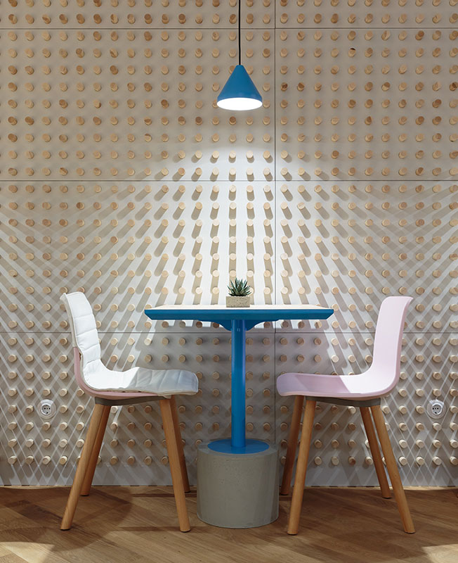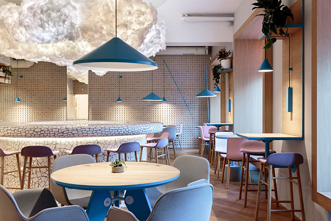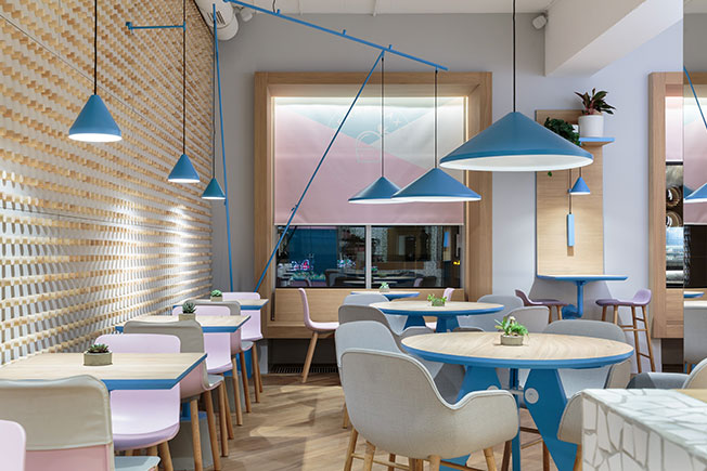 «В интерьер нужно было ввести дополнительный цвет, который бы отлично сочетался с небесно-голубым, белым и серым, а также вызывал аппетит, ассоциируясь с пирожными. Поэтому столы дополняют современные стулья в нежно-розовых обивках.