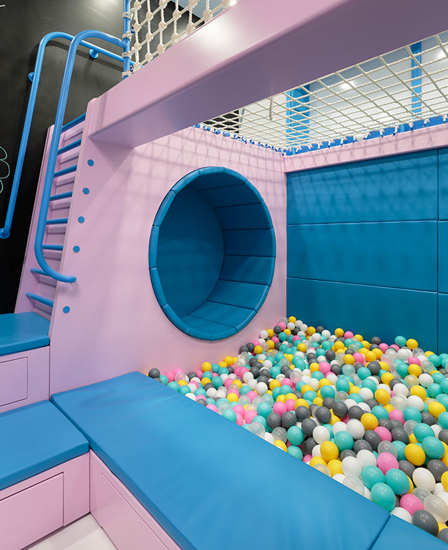 Двухуровневую детскую комнату расположили в дальнем конце кондитерской за стеклянной перегородкой, через которую родители могут наблюдать за своими малышами. Детская разделена на несколько уровней: игровая зона с телевизором и двухступенчатым амфитеатром, зона бассейна с шарами, сетка и канат.