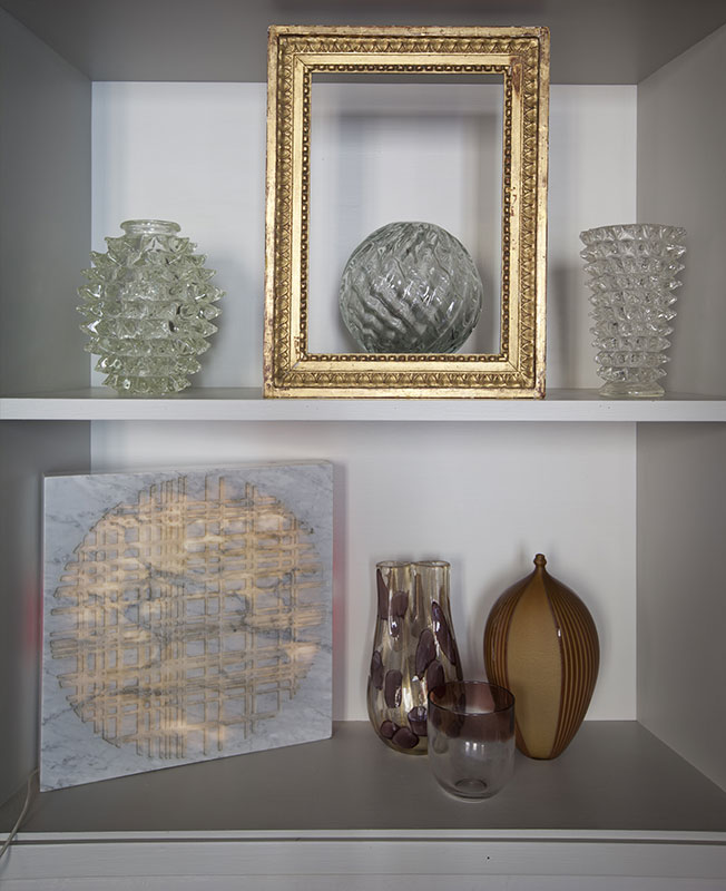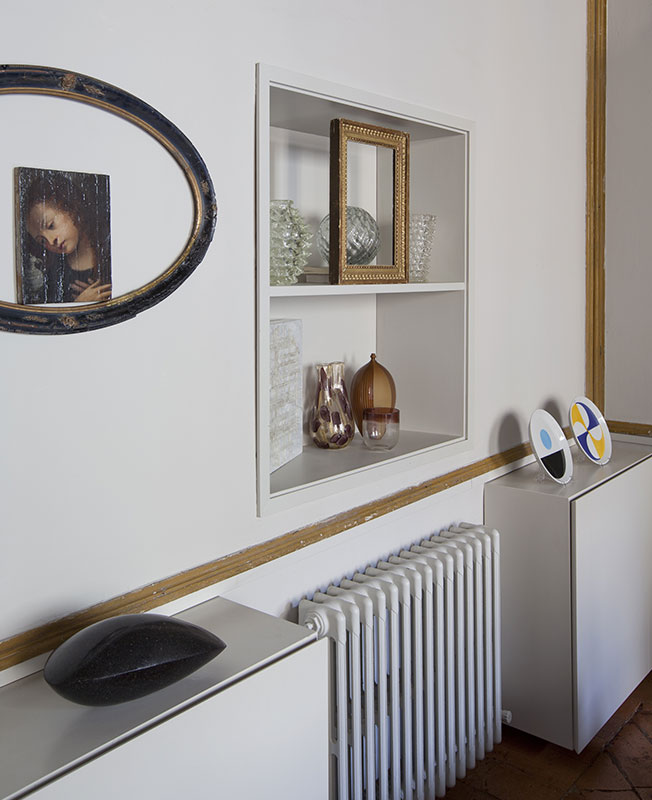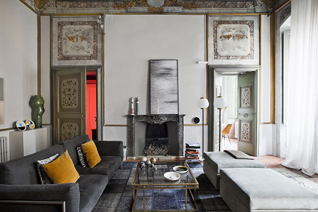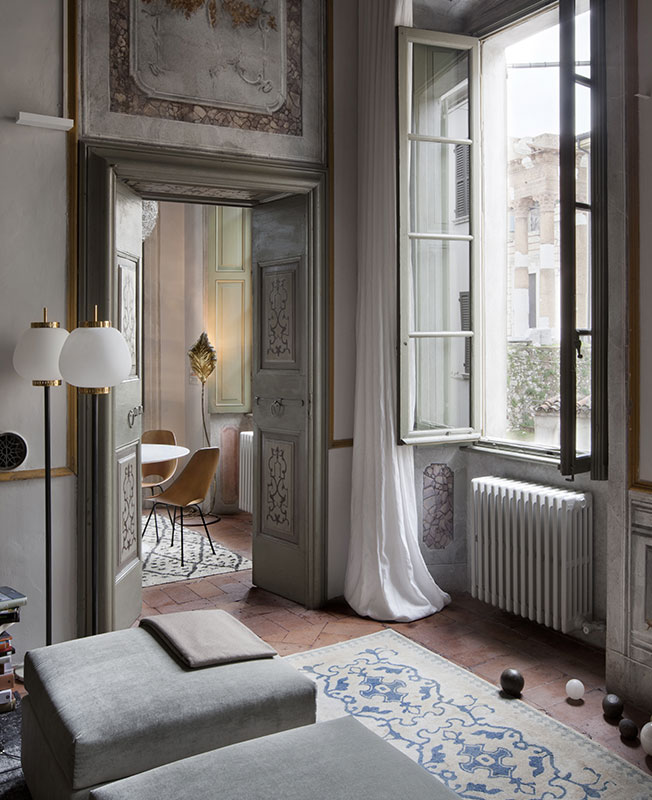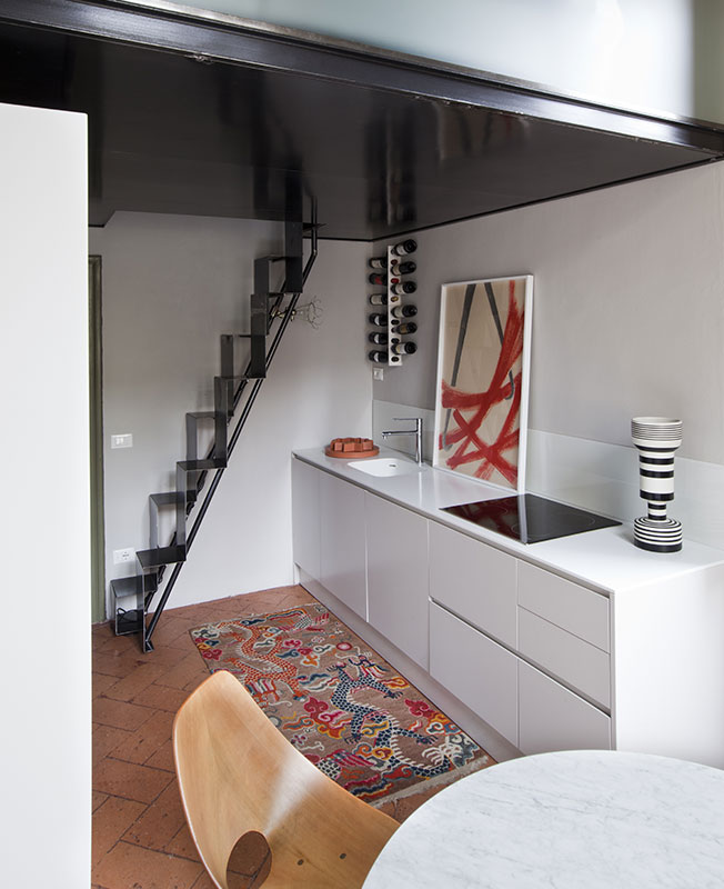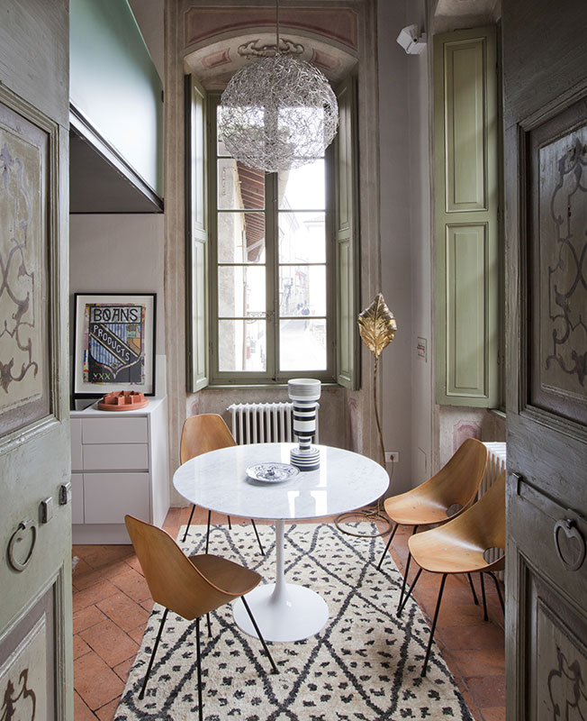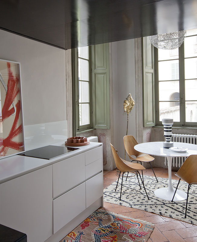 Квартира изначально была богата декором и не нуждалась в украшательстве. Единственное, в чем Антонио и Кристиан позволили себе вольность, так это в коврах. Как правило, небольшие по размеру и орнаментальные, они очень оживляют пол из неглазурованной керамической плитки. Один в гостиной подхватывает узором роспись дверного полотна, другой перекликается красными линиями с современной абстракцией на кухне, третий в столовой вторит черно-белой графике скульптурного тотема Этторе Соттсасса.
