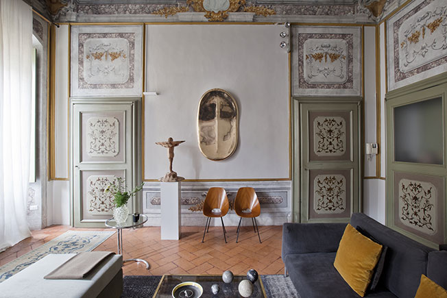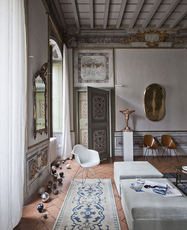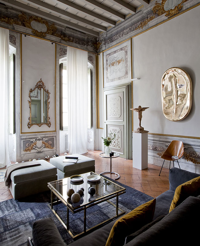 Как говорят хозяева, уважение к прошлому стало их философией. Оно выразилось не только в бережном сохранении старинных элементов — дверных полотен, потолочных балок, керамических полов, оконных рам, золоченых карнизов. Но также в том, что для наполнения интерьера были выбраны подчеркнуто скромные вещи.