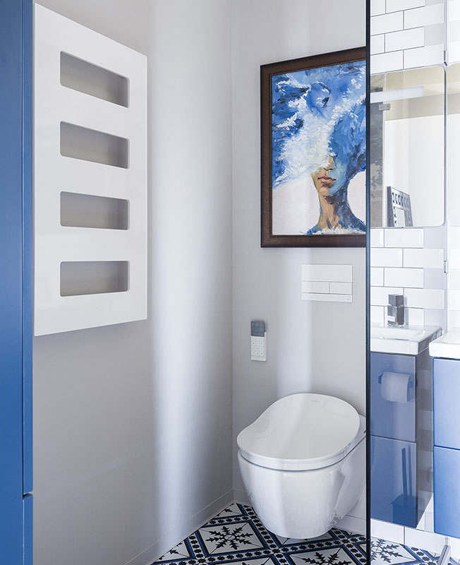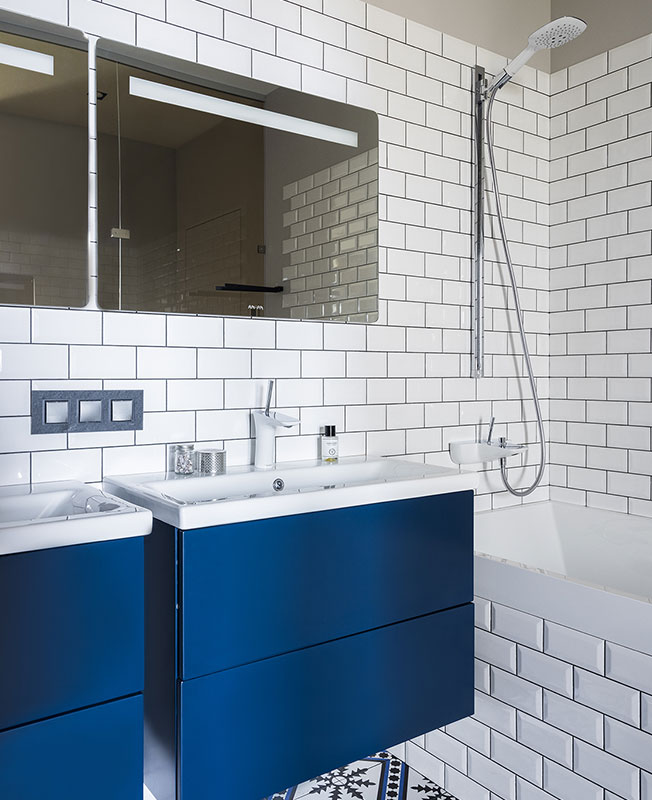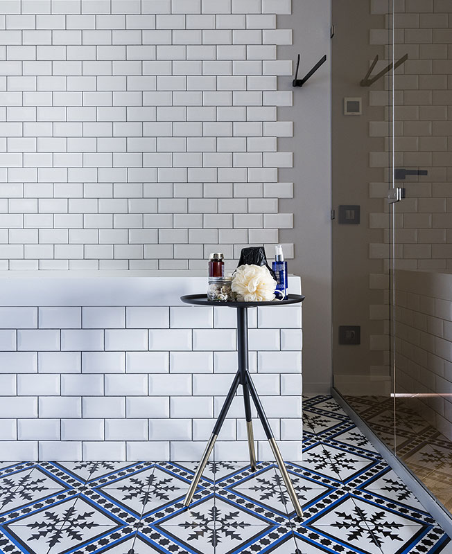 Ванная при спальне хозяев. Активная орнаментальная плитка интересно сочетается с классической белой плиткой «метро». Столик из магазина скандинавской мебели @lappartement.ru.
