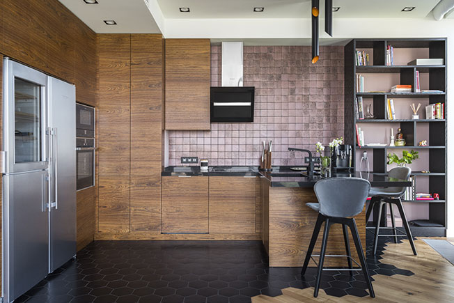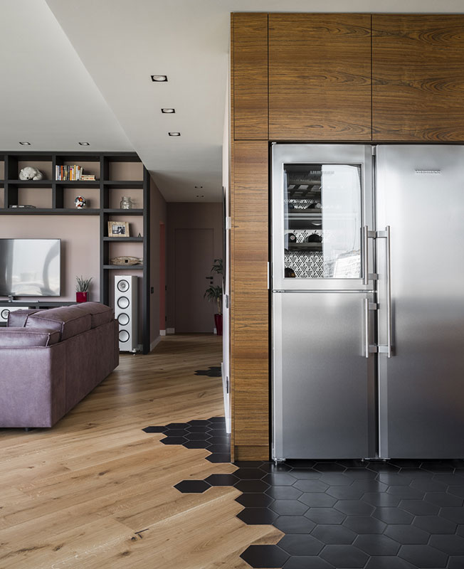 В зоне кухни паркетная доска Barlinek (коллекция Senses) сменяется плиткой актуальной шестиугольной формы.