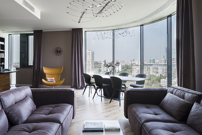«Уже в процессе реализации мы добавляли в интерьер больше цвета, подбирали мебель и декор согласно изменившемуся вкусу, использовали много интересных материалов», — вспоминает автор проекта. Важно. что и палитра и предметы интерьера не оттягивают внимания от панорамы за окном, гармонично сочетаются с городским пейзажем.