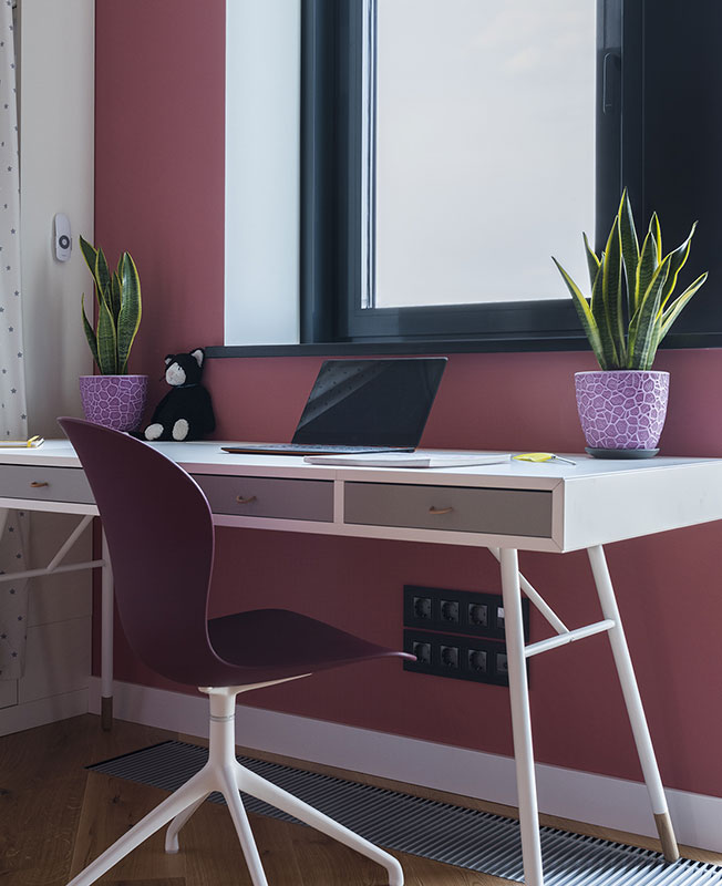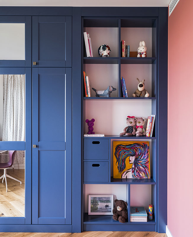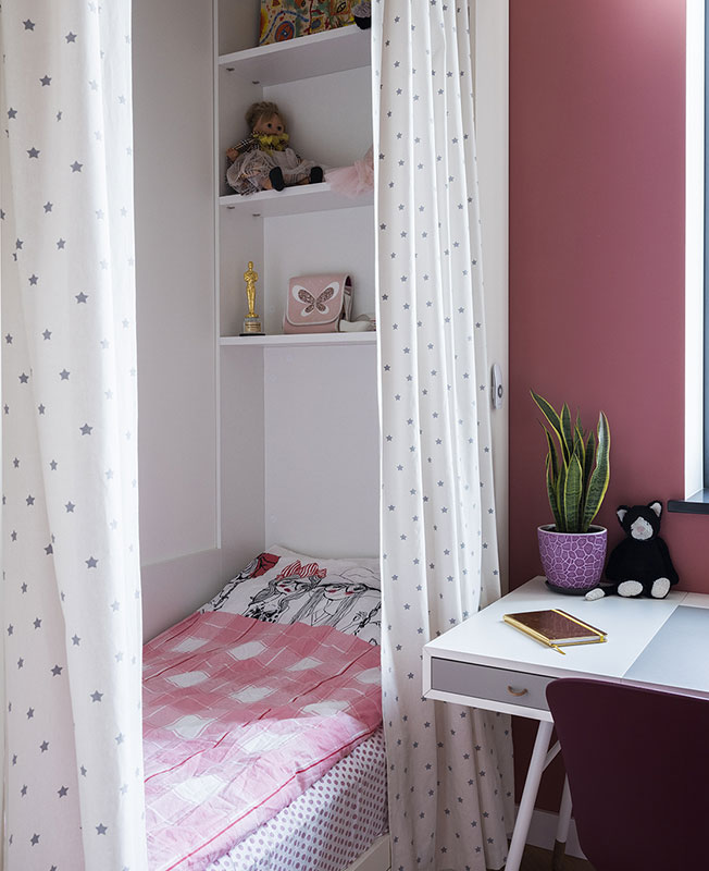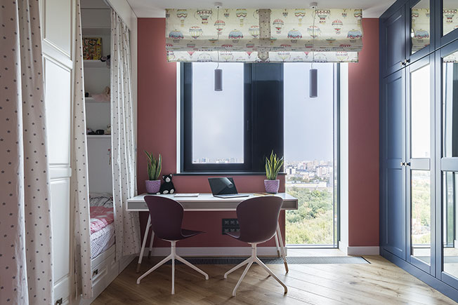 Сложной задачей стало поселить двух девочек в одну детскую комнату. Но решение нашлось: была разработана конструкция с двумя спальными местами и шторками, которые скрывают детей от мира взрослых. Эта идея пришлась по вкусу маленьким членам семьи. «Дети настолько вдохновилась интерьером, что проявили инициативу и сами написали картины для своей комнаты. Нам было очень приятно».