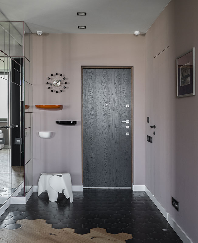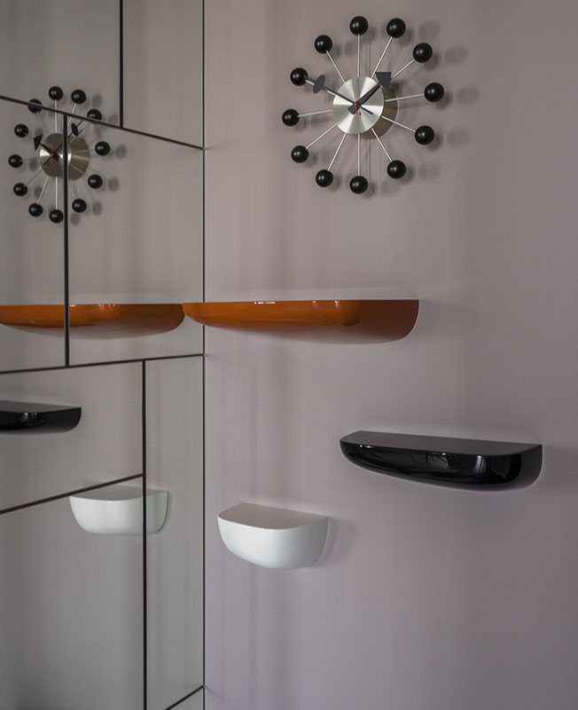 Прихожая. Часы, декоративные полки, слон — все Vitra. Зеркальное панно вычерчено Ренатой Кукряковой и изготовлено на заказ. Фрагменты приклеивались штучно, с зазором в полсантиметра, чтобы подчеркнуть геометрию полотна.