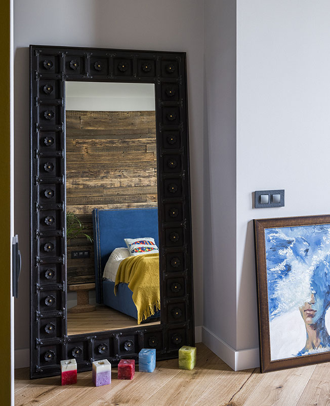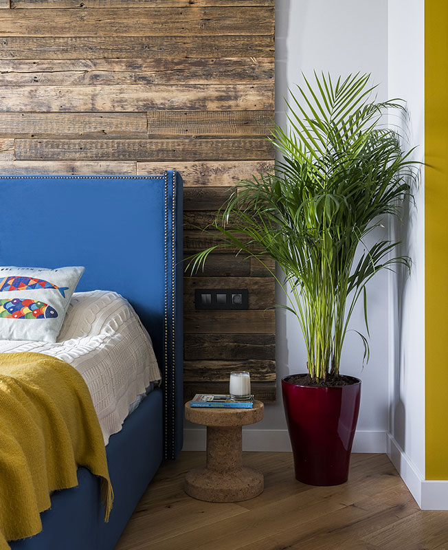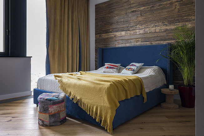 В спальне родителей стена за изголовьем кровати отделана винтажной амбарной доской. У этого материала необыкновенная история. Старые доски были раньше пригородным домиком родителей заказчика в Калужской области. Когда построили новый дом, доски переехали в мастерскую и затем нашли свое место в спальне хозяев. Тем самым внесли кусочек истории семьи в новое жилище.