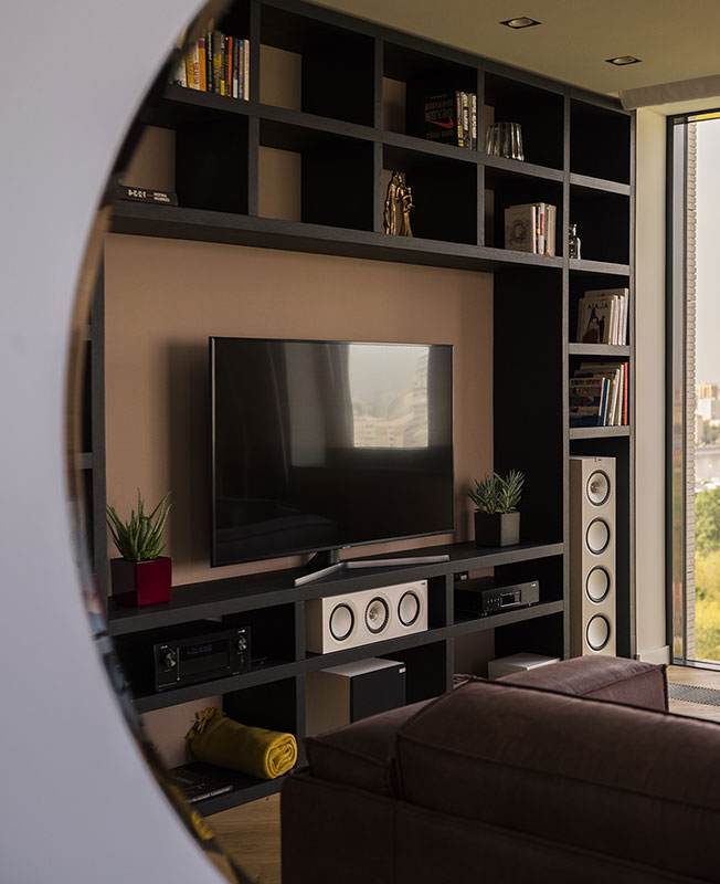 В зеркале отражаются телевизор Samsung, профессиональная акустическая система Denon и KEF.