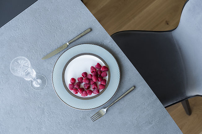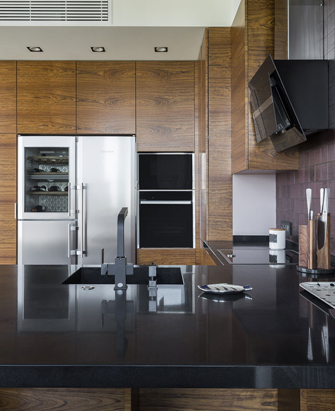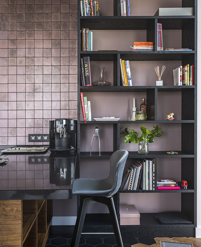 Кухня и стеллаж Enjoy Home, столешница из материала Interquartz, барные стулья BoConcept.